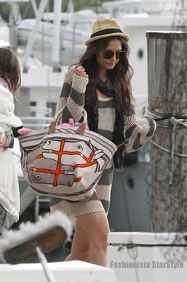 ■8月2日ニューヨークでアメリカNBCの深夜トーク・バラエティ番組 「The Tonight Show with Jay Leno(ザ・トゥナイト・ショウ・ウィズ・ジェイ・レノ)」に Madewell(メイドウェル)のメッシュニット(Saltspring)にIsabel Marant (イザベルマラン)Fall 2010 collectionのレッドデニムにPRADA(プラダ)の パテントレザーローファーパンプスで出演したケイティ・ホームズ(Katie Holmes) 。