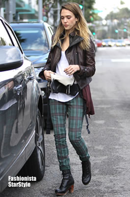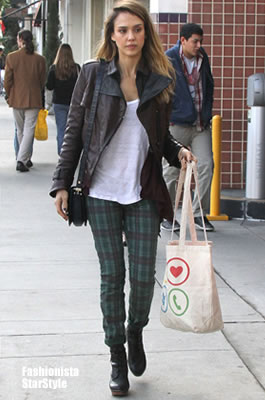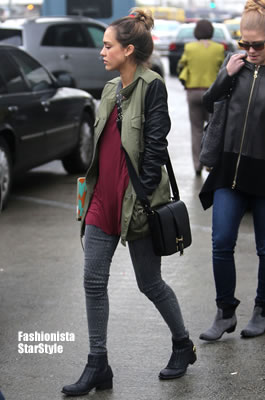 レザーライダースジャケットを着てお買い物に出かけたジェシカ・アルバ(Jessica Alba)。