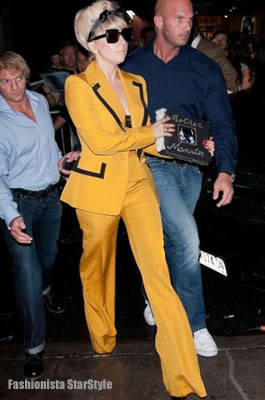 レディー・ガガ(Lady Gaga)ストリートスナップ・ヴィクター&ロルフ(Viktor & Rolf)カラシ色スーツでビーコン・シアターへ!
